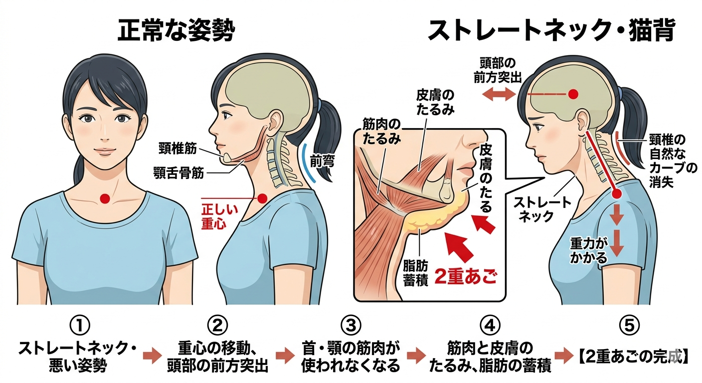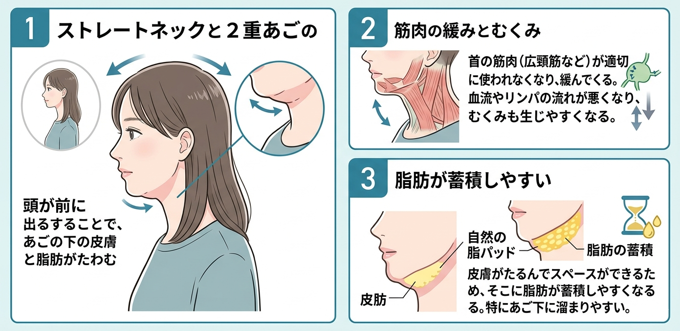 ストレートネック: 頭が前に出ることで、あご下の空間が余り、筋肉が常に「緩んだ(たるんだ)」状態になる