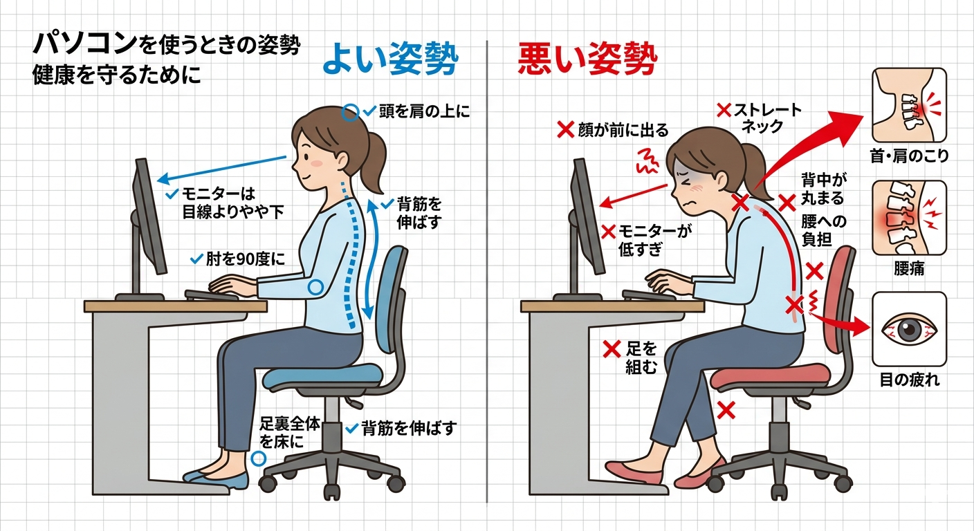 PC作業が多い場合は、モニターの高さを目線の位置に調整してください
