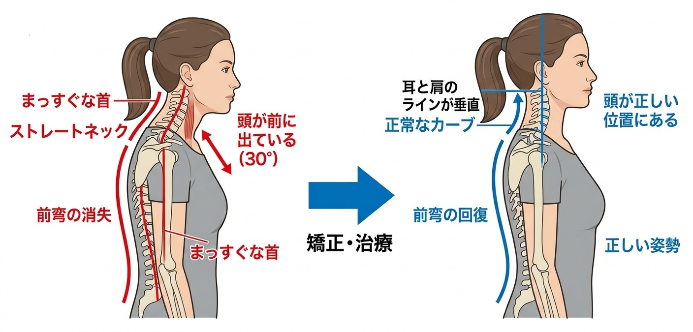 ストレートネックになると、本来あるべき首の曲線が失われ、頭が数センチ前方へ突き出した状態になります
