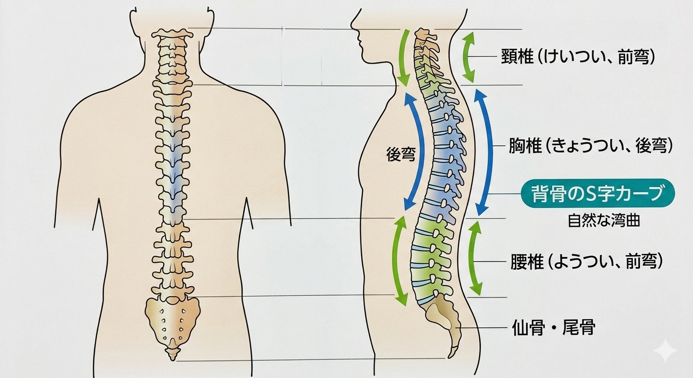 背骨が真っ直ぐではなく「S字状」にカーブしていることで、歩行時やジャンプ時に地面から伝わる衝撃をバネのように吸収します。