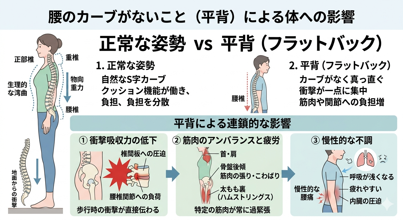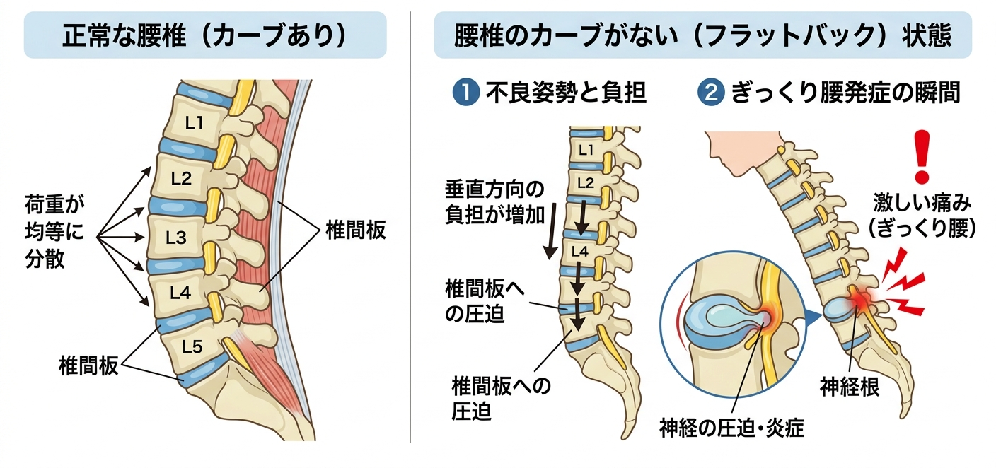カーブがないことにより、腰に負担がかかり筋肉の疲労が取れにくくなるため、ぎっくり腰の原因になります