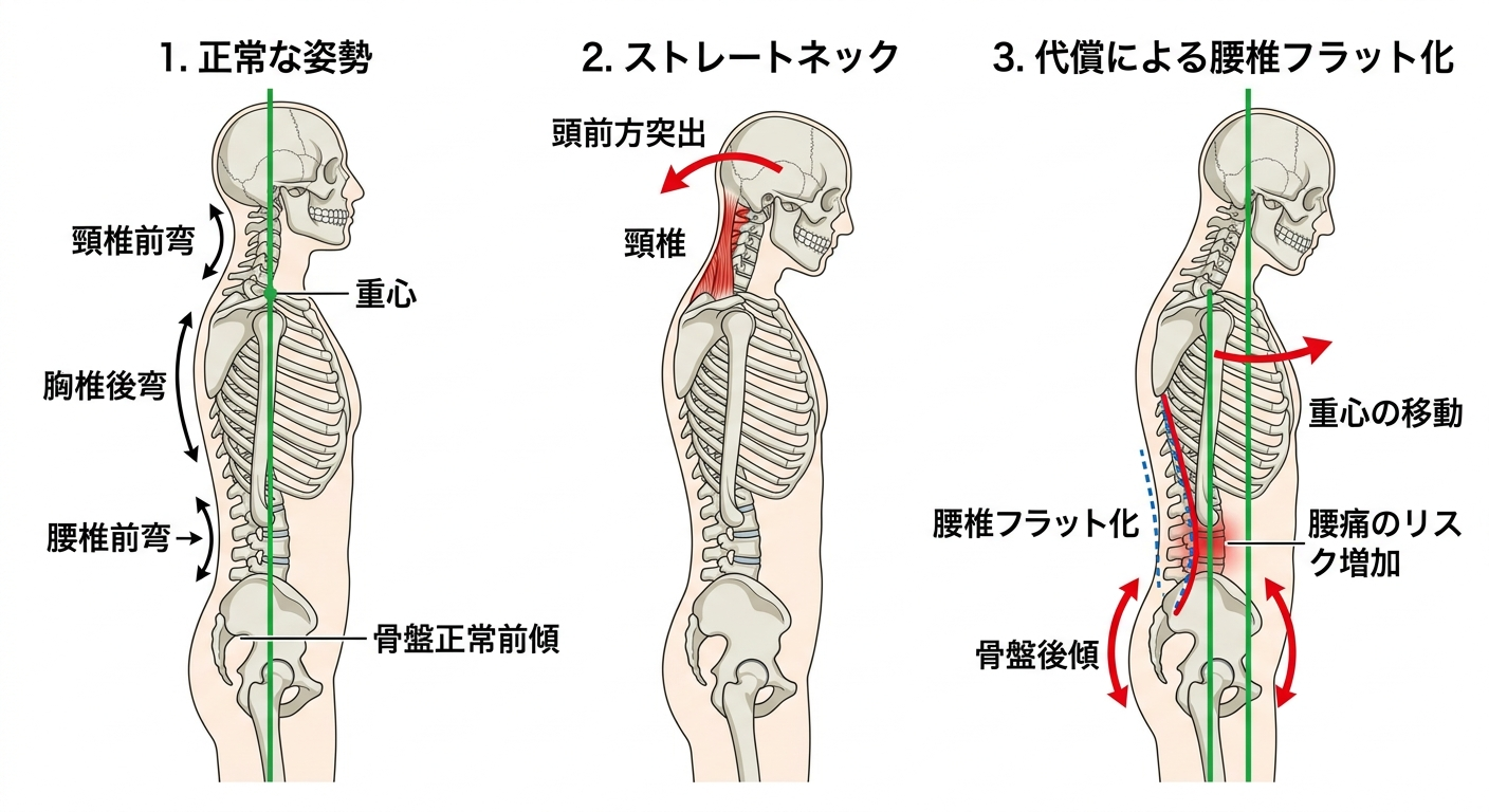 なので腰のカーブがない場合は首のカーブもない(ストレートネック)可能性が高いです