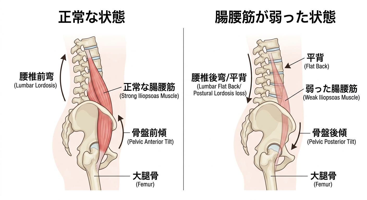 骨盤との連動: 腰椎のカーブが骨盤の傾きを調整し、股関節がスムーズに動くための土台となります。