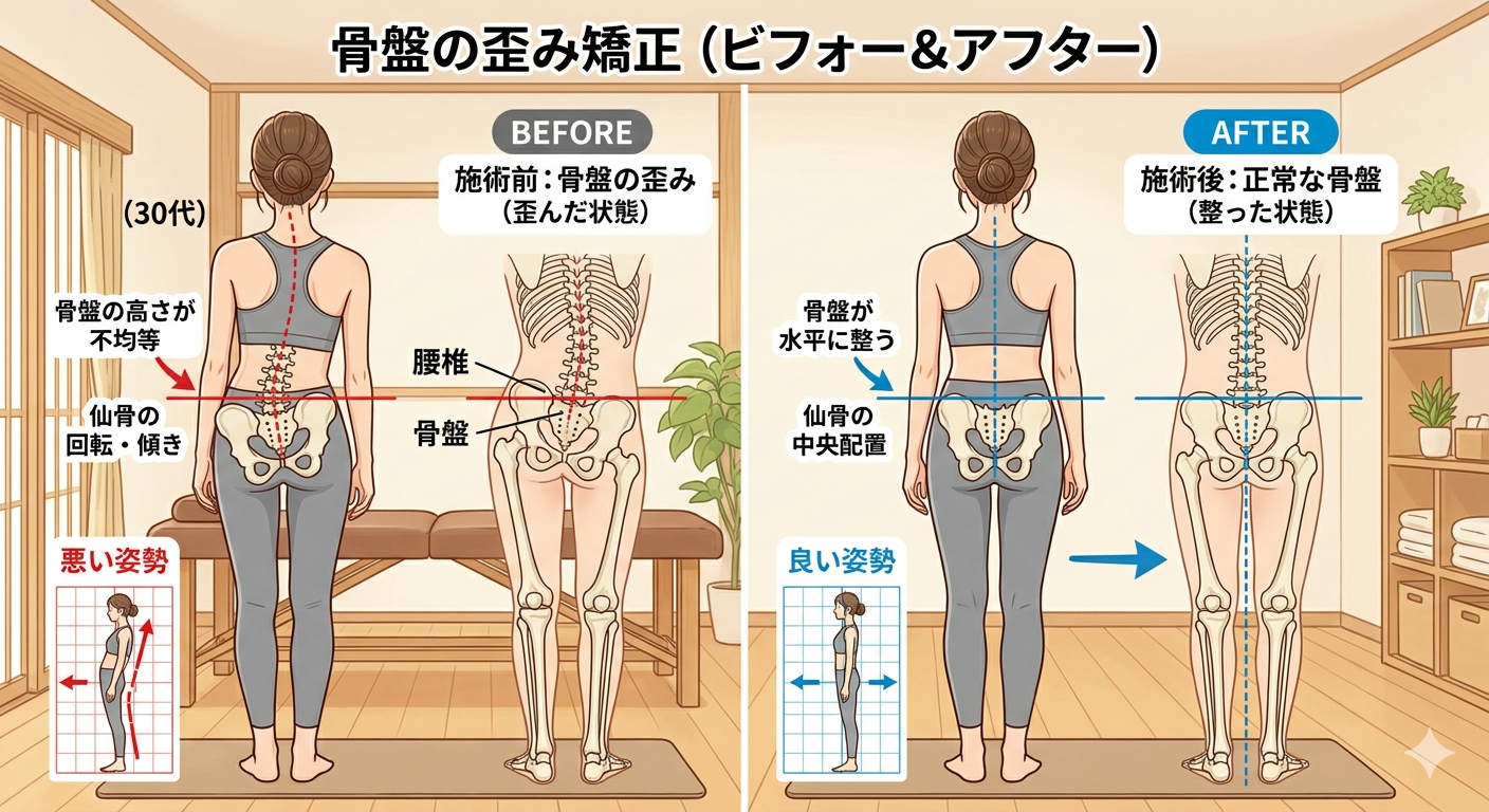 骨盤のゆがみもあることが多いので、それも戻してあげる方が良いです