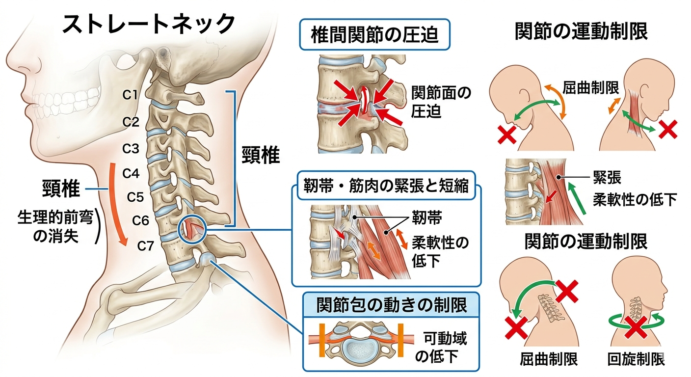 このように、骨格の変形が筋肉と関節の両方に負担をかけ、首の動きを妨げる原因となります